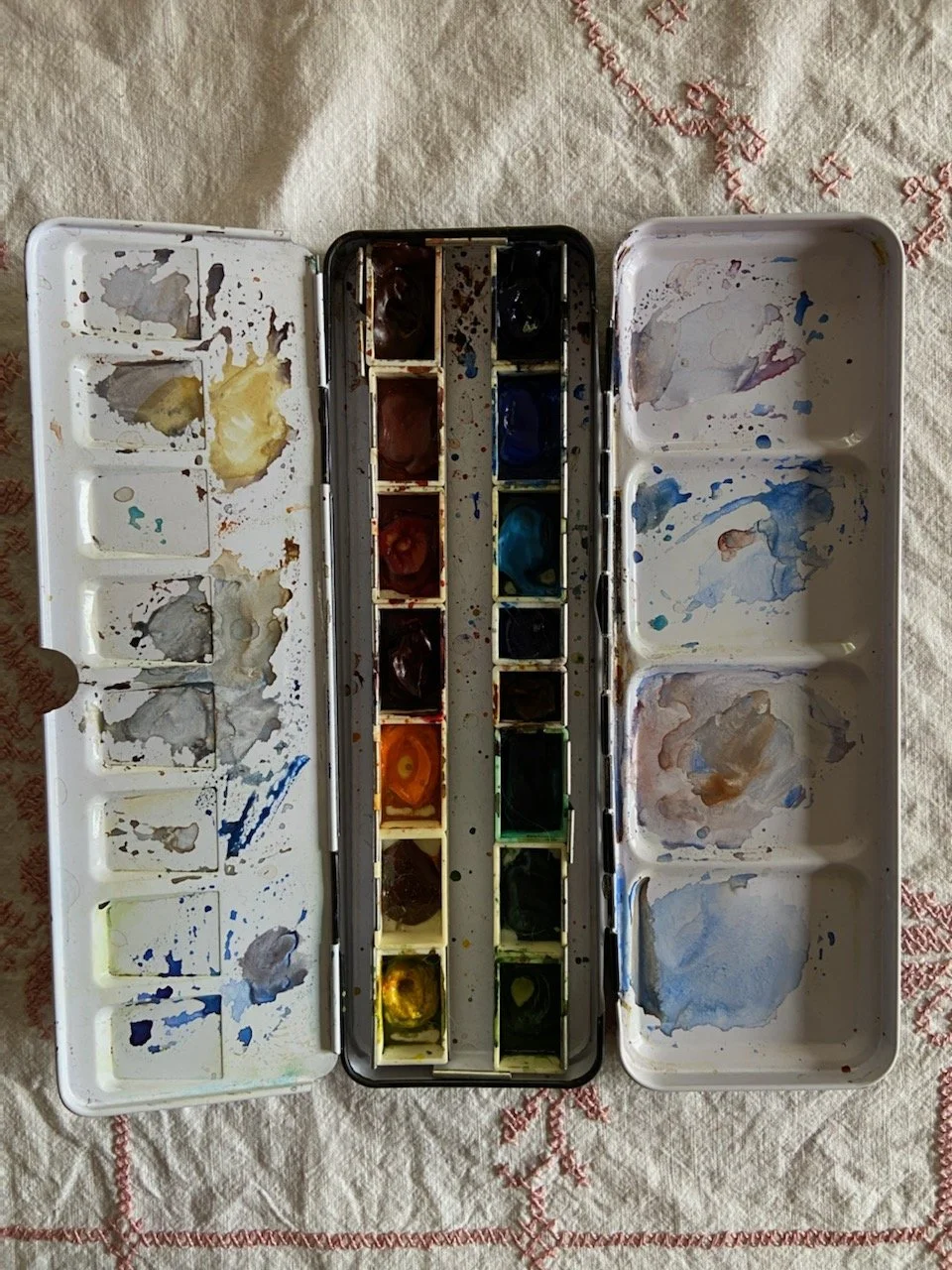I buy tube paint and squeeze it out into those little 1/2 pans you can buy for a watercolor tin - photo below. While you see 15 colors in the tin, in fact I really only use 7 on a regular basis. These are: